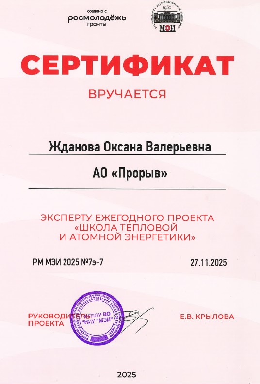 По итогам лекции Ждановой Оксане был вручен сертификат эксперта «Школа тепловой и атомной энергетики» ИТАЭ НИУ МЭИ.