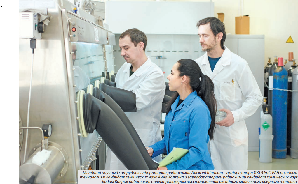 «В настоящее время эффективность технологии подтверждена на модельном ядерном топливе (МЯТ) на площадке ИВТЭ УрО РАН в Екатеринбурге. Проведена также сквозная проверка подхода на смешанном нитридном уран-плутониевом МЯТ на базе АО “Сибирский химический комбинат”. Кроме того, в АО “Государственный научный центр — Научно-исследовательский институт атомных реакторов” реализуется пооперационная проверка пирохимии на реальном ОЯТ. Работы с настоящим облученным ядерным топливом достаточно сложны и требуют значительной подготовки, — сообщила А.С. Холкина. — Кроме того, в связи с высоким тепловыделением и радиационной активностью возникает необходимость использования дистанционных средств обслуживания (манипуляторов и роботизированных систем). Работы в данном направлении ведутся совместно с Центральным научно-исследовательским и опытно-конструкторским институтом робототехники и технической кибернетики в Санкт-Петербурге».